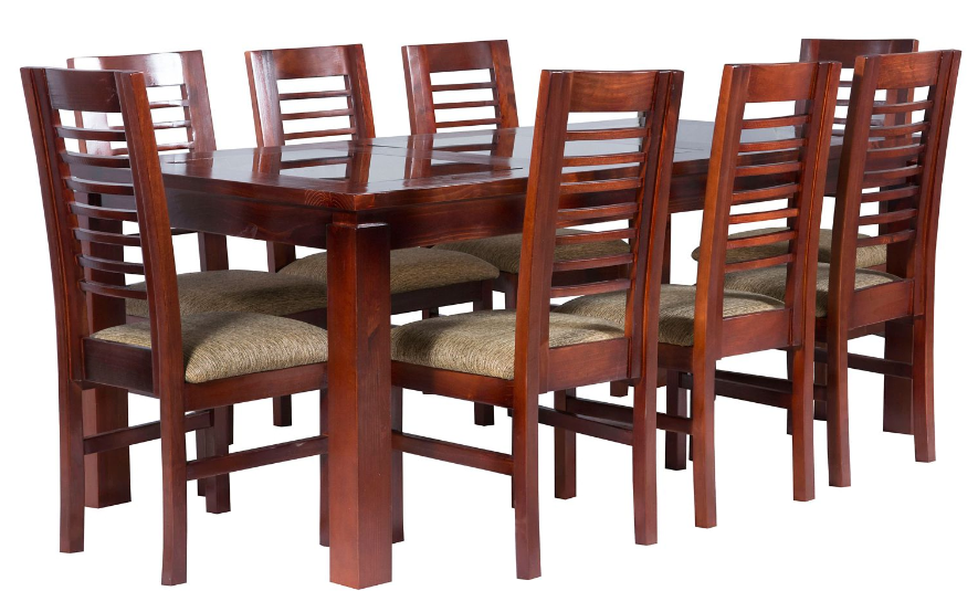 Comedor Florencia color Caramelo de madera sólida, NO ENCHAPADO de Pino Radiata o Insigne. Mesa cuadrada con 8 sillas firmes, armado con tarugos y pegamento de alta calidad para garantizar un producto resistente.