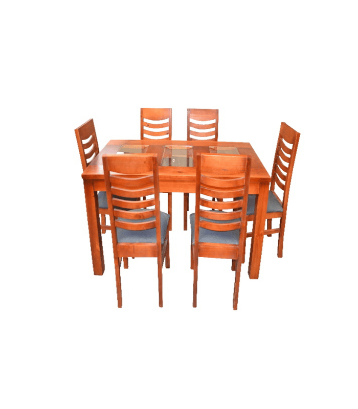 Comedor Némesis color Caramelo de madera sólida, NO ENCHAPADO de Pino Radiata o Insigne. Mesa cuadrada con 6 sillas firmes, armado con tarugos y pegamento de alta calidad para garantizar un producto resistente.